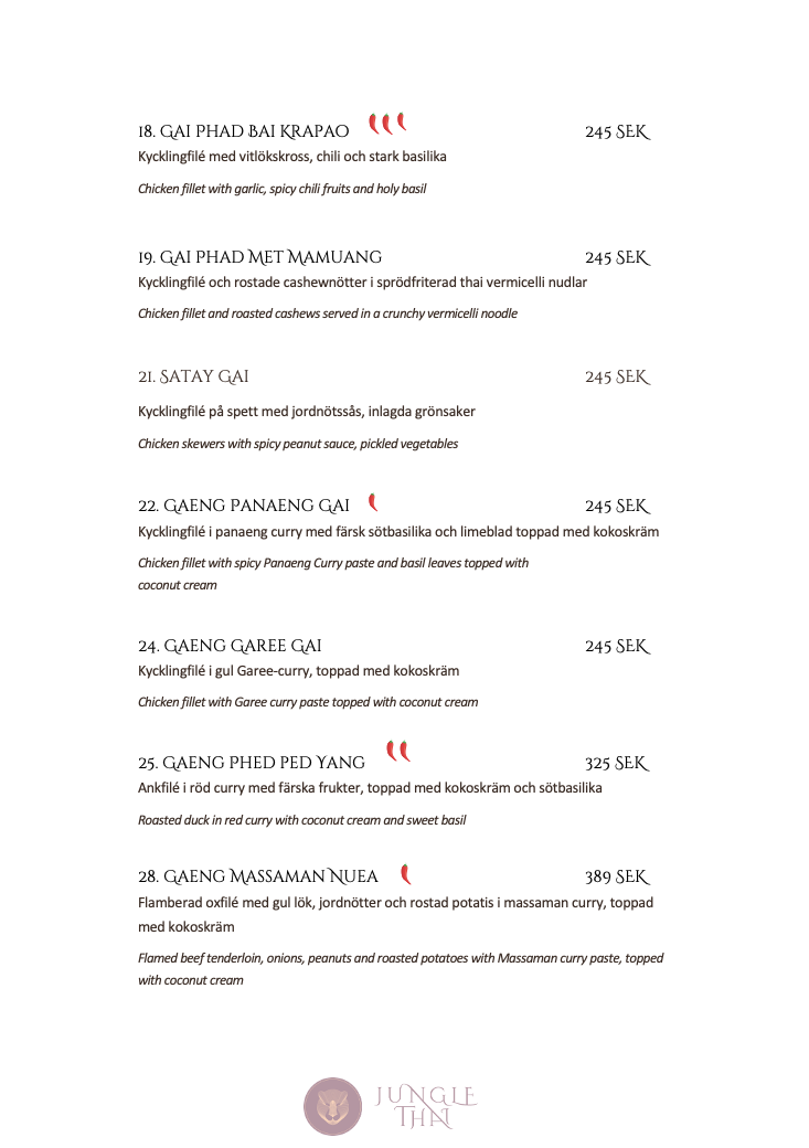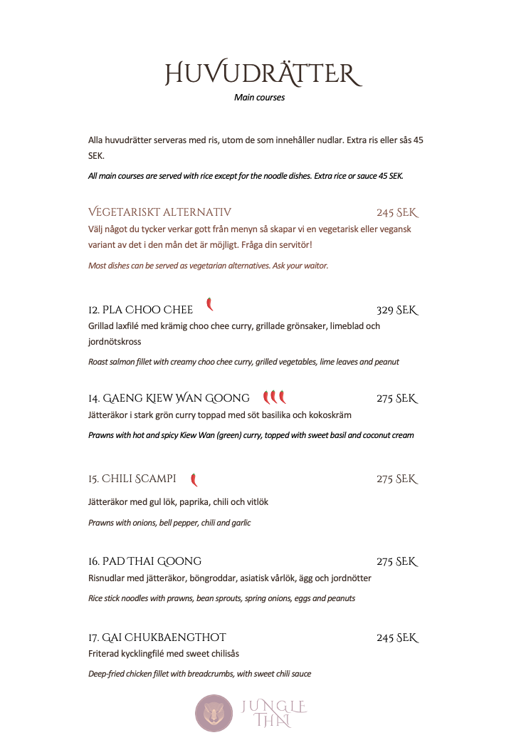 Jungle Thai är en premium thailändsk restaurang i centrala Jönköping. Här på Jungle Thai, JT, granne med vackra nygotiska Sofiakyrkan, skapar vi magi. En institution på thailändsk mat och drinkar sedan 2001. Autentisk thai mat i härlig miljö, teakinredning inspirerad från Siamesiska-perioden under Chakridynastin i Thailand. JT är den enda thai restaurang i Sverige som blivit omnämnd av thailändska guiden Mthai.