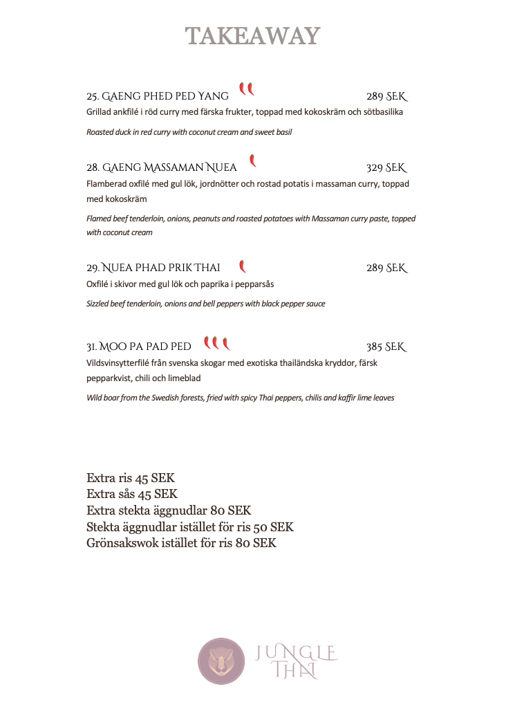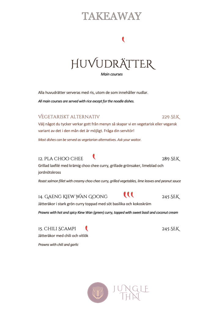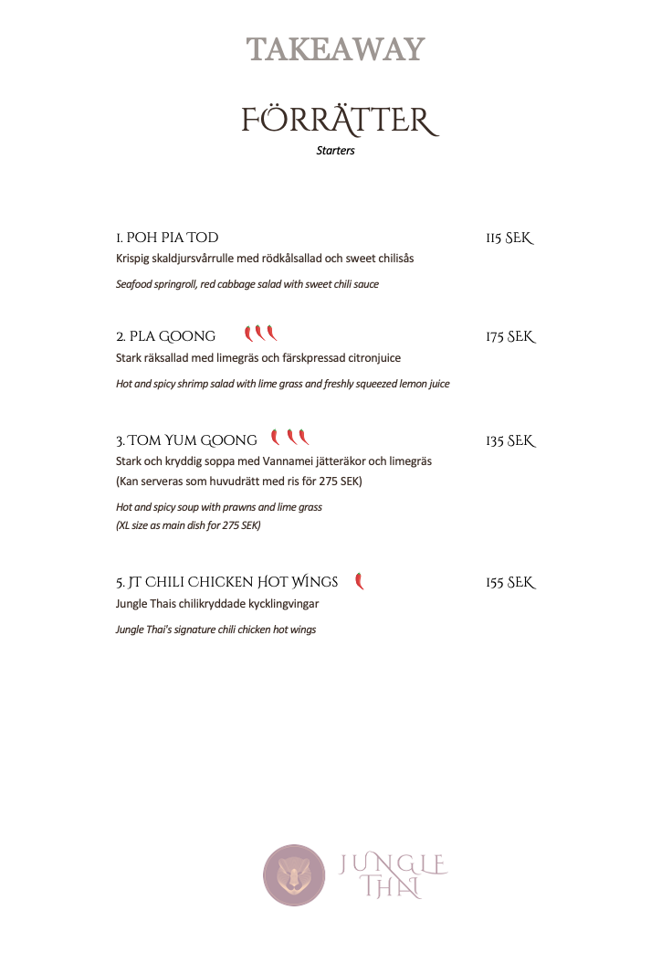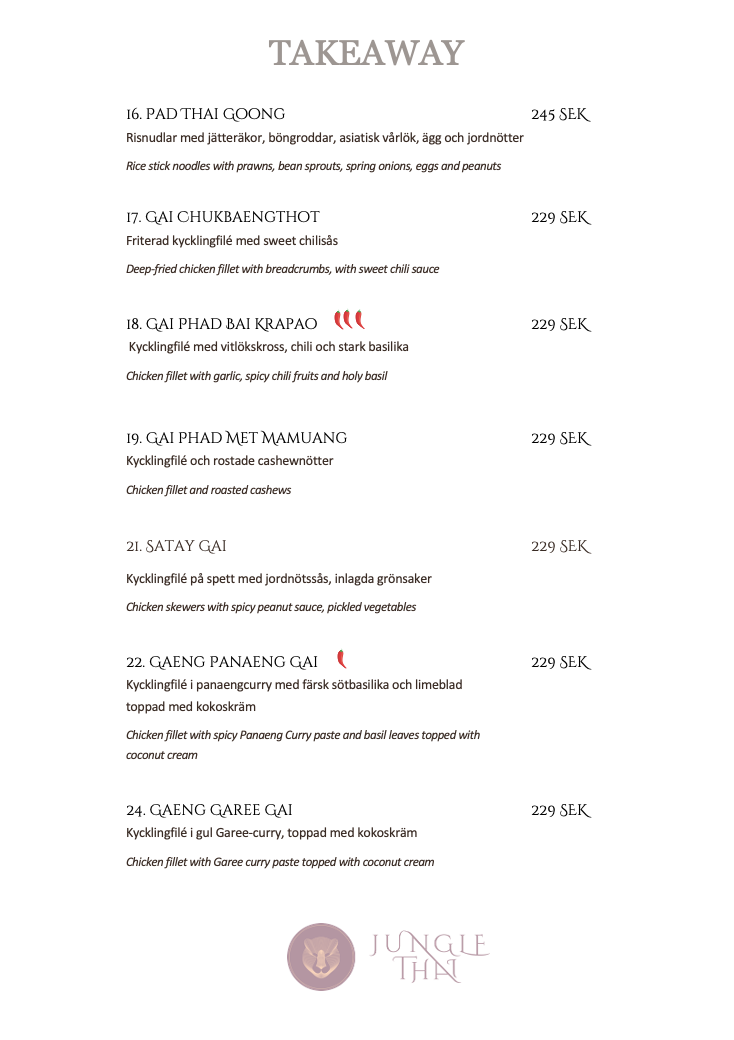 Jungle Thai är en premium thailändsk restaurang i centrala Jönköping. Här på Jungle Thai, JT, granne med vackra nygotiska Sofiakyrkan, skapar vi magi. En institution på thailändsk mat och drinkar sedan 2001. Autentisk thai mat i härlig miljö, teakinredning inspirerad från Siamesiska-perioden under Chakridynastin i Thailand. JT är den enda thai restaurang i Sverige som blivit omnämnd av thailändska guiden Mthai.